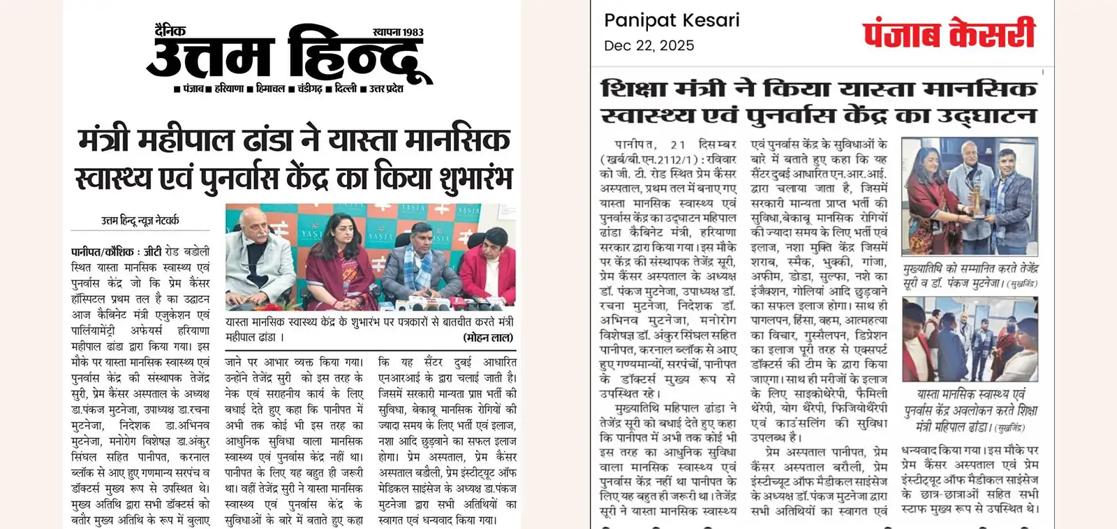 Official inauguration of YASTA Mental Health & Rehabilitation Centre by Haryana Cabinet Minister Shri Mahipal Dhanda at Prem Hospital, Panipat. Marking a significant step for mental health in the city, YASTA brings together modern psychiatry and holistic therapies, backed by over 20 years of clinical expertise.